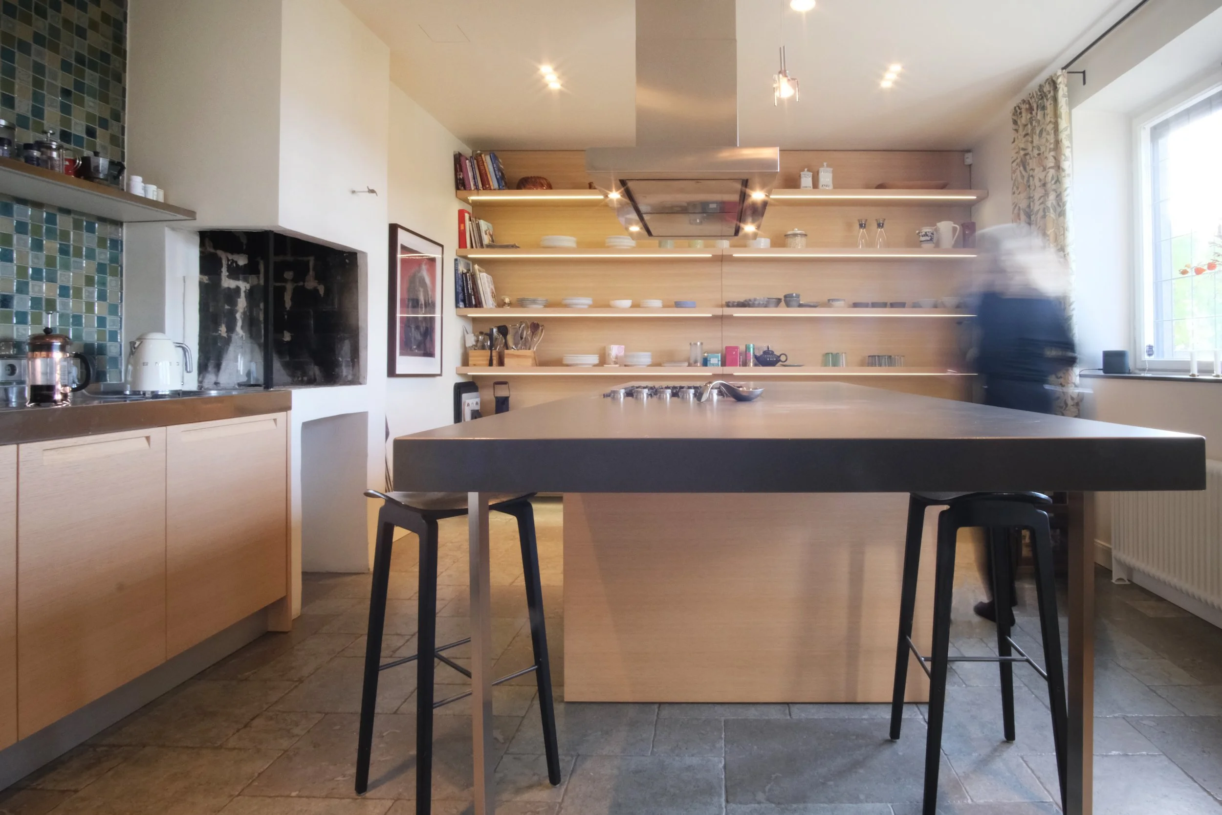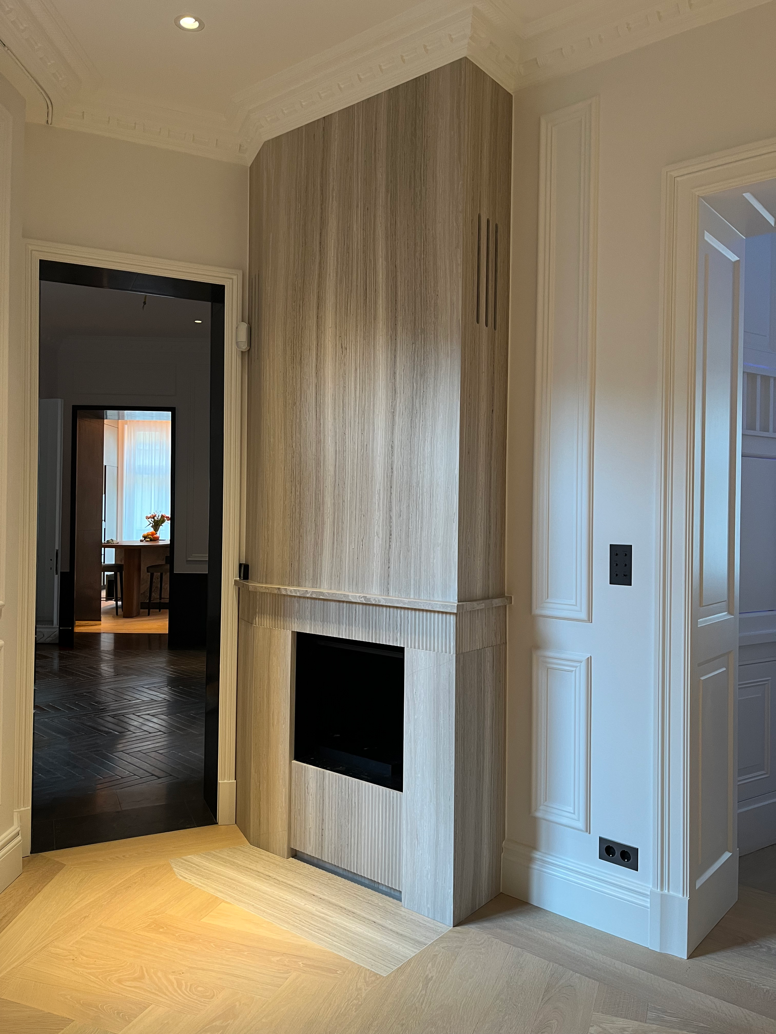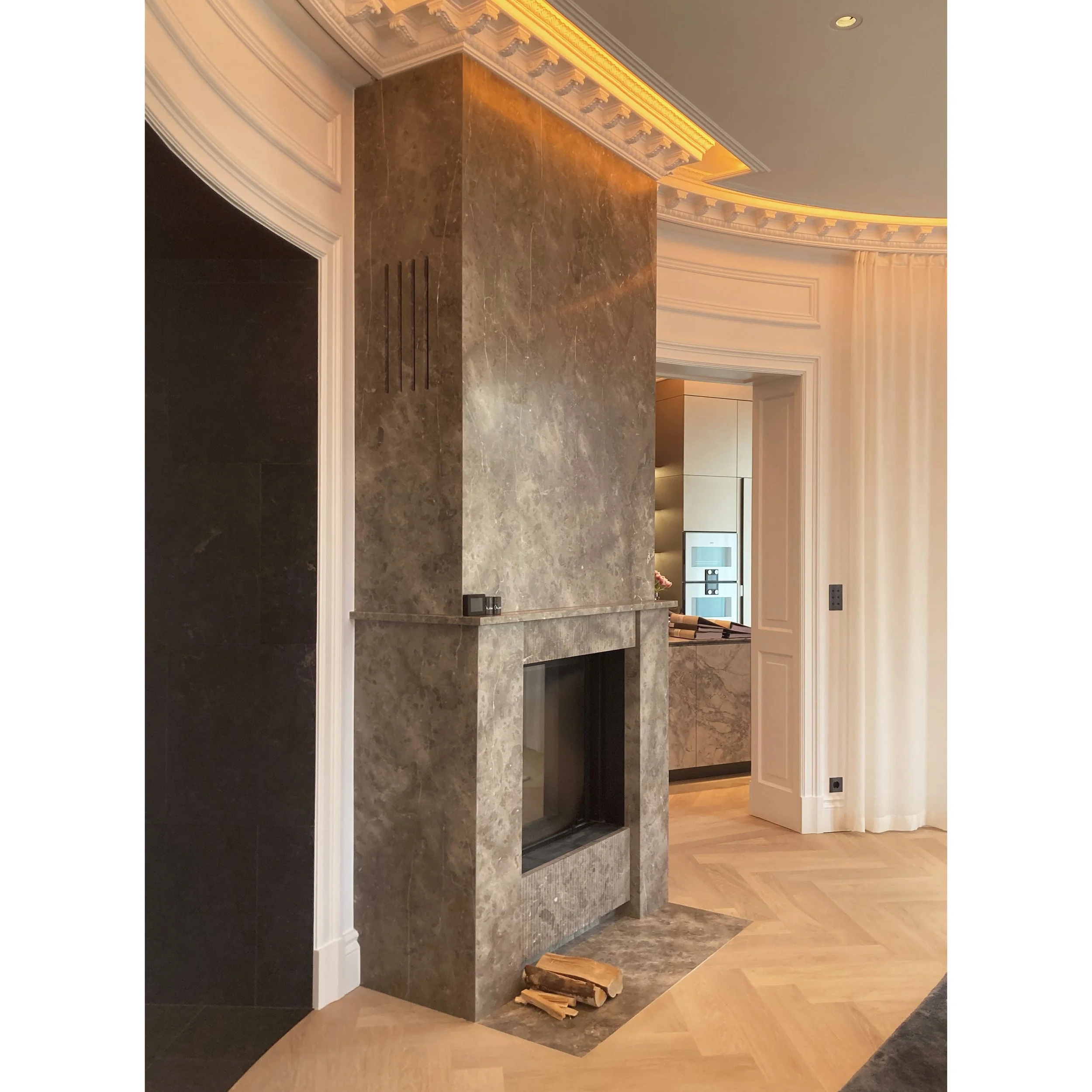 A bespoke fireplace in Salvatori stone, adding texture and sophistication to the space.