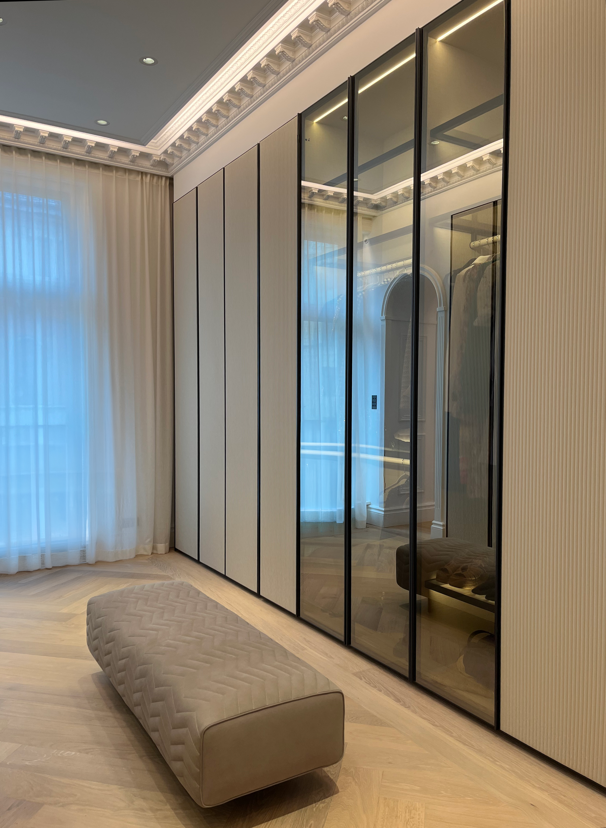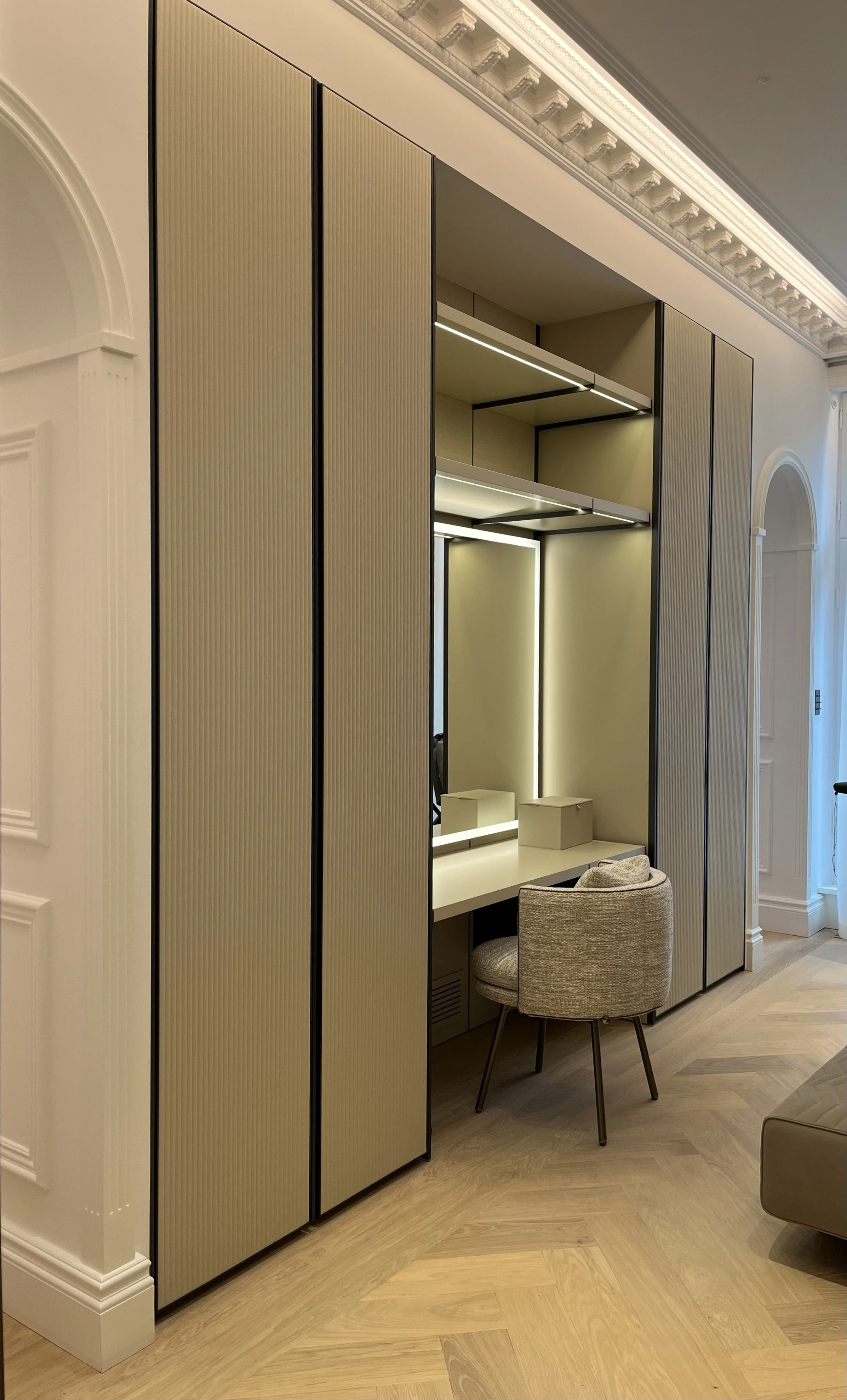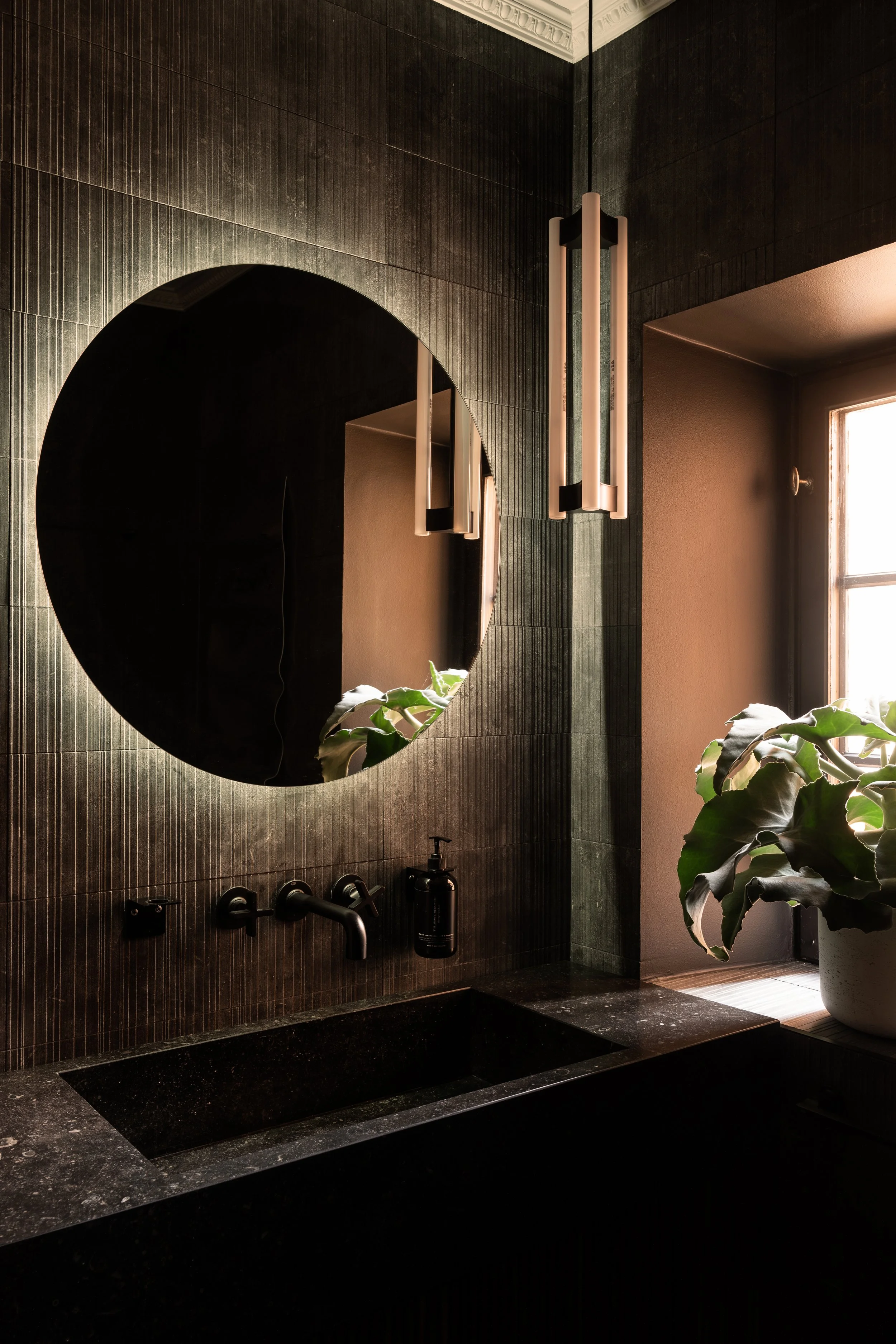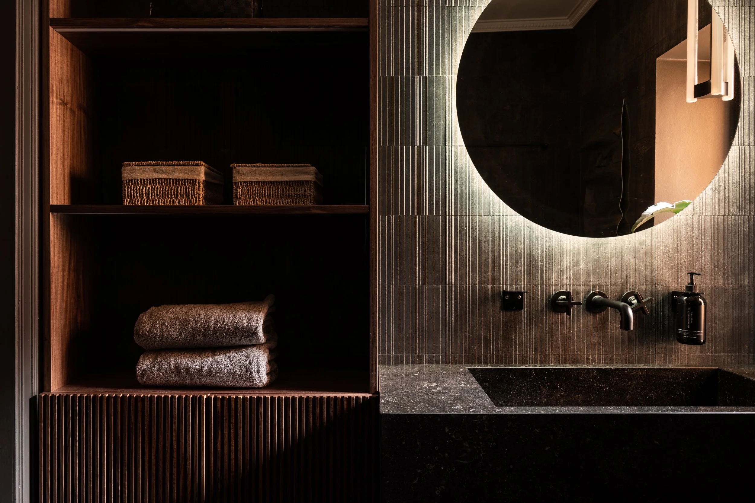 A bespoke fireplace in Salvatori stone, adding texture and sophistication to the space.