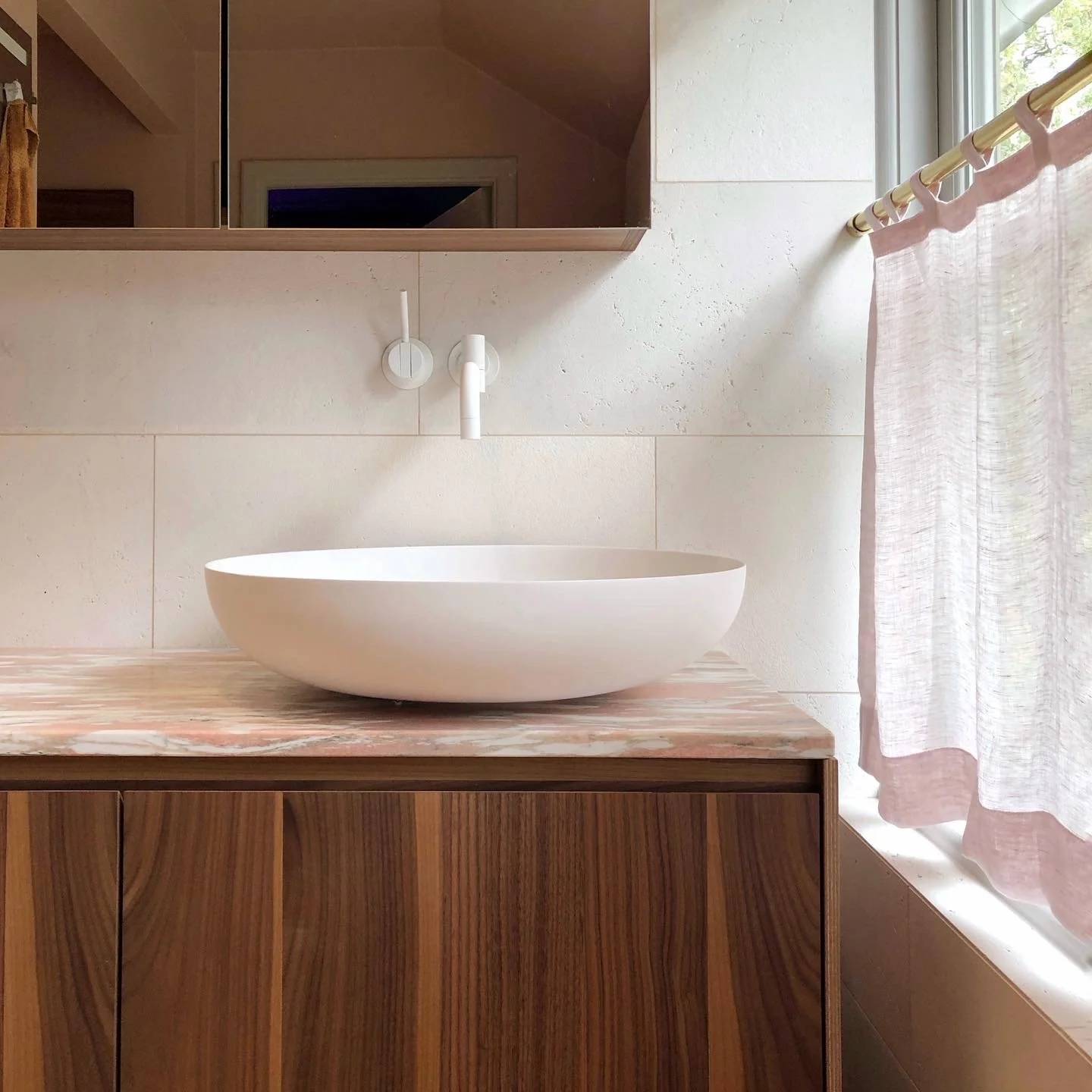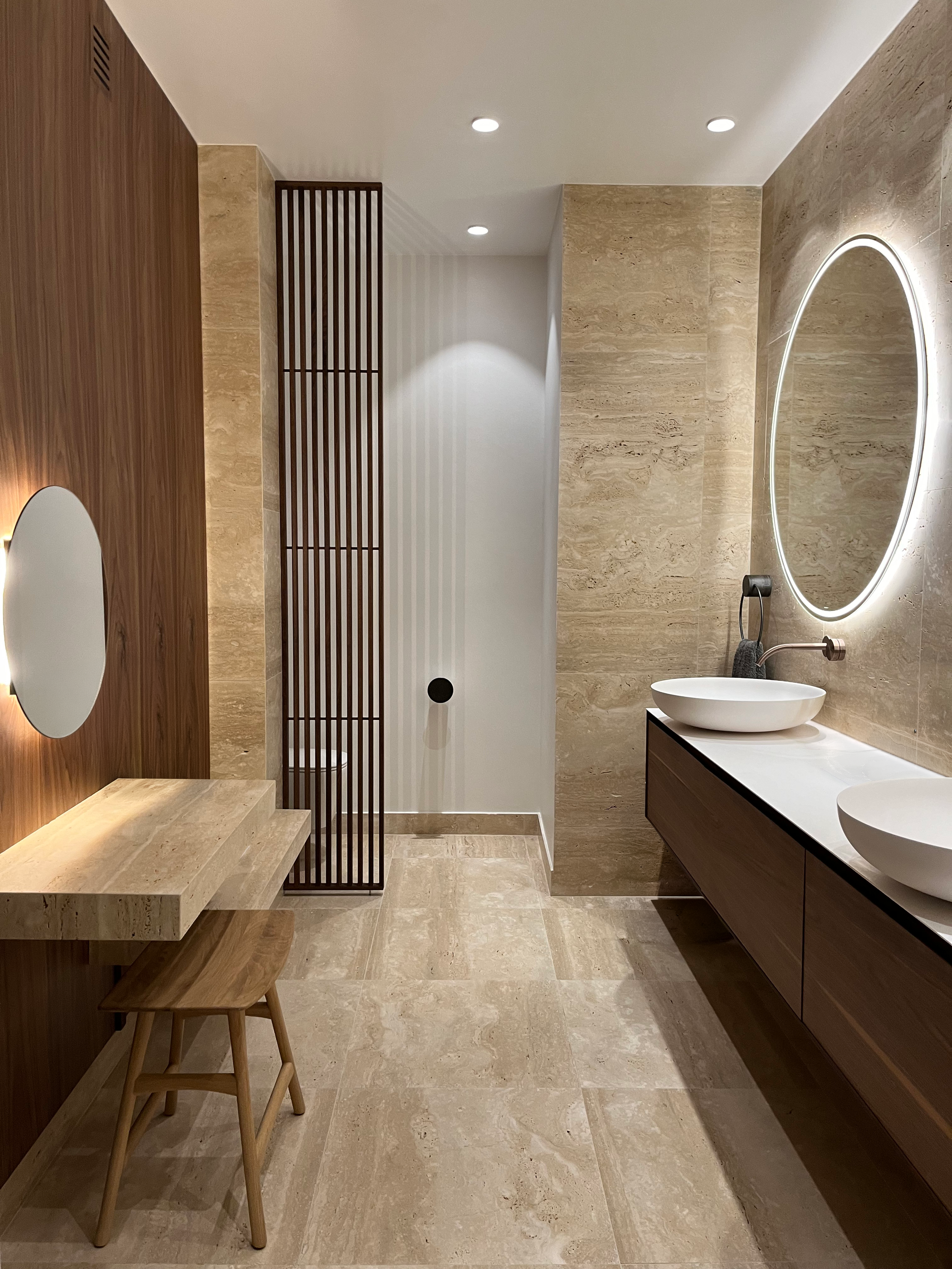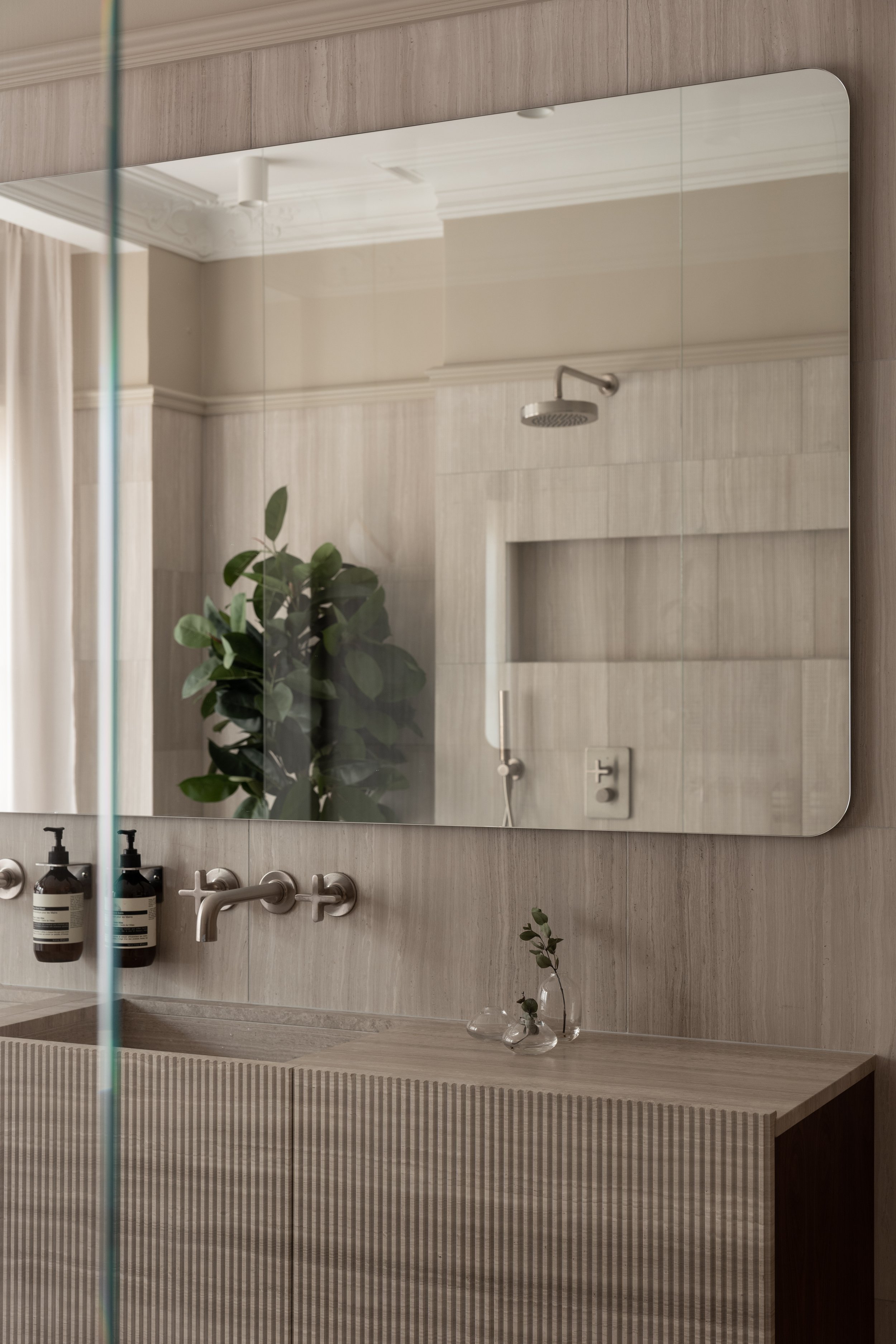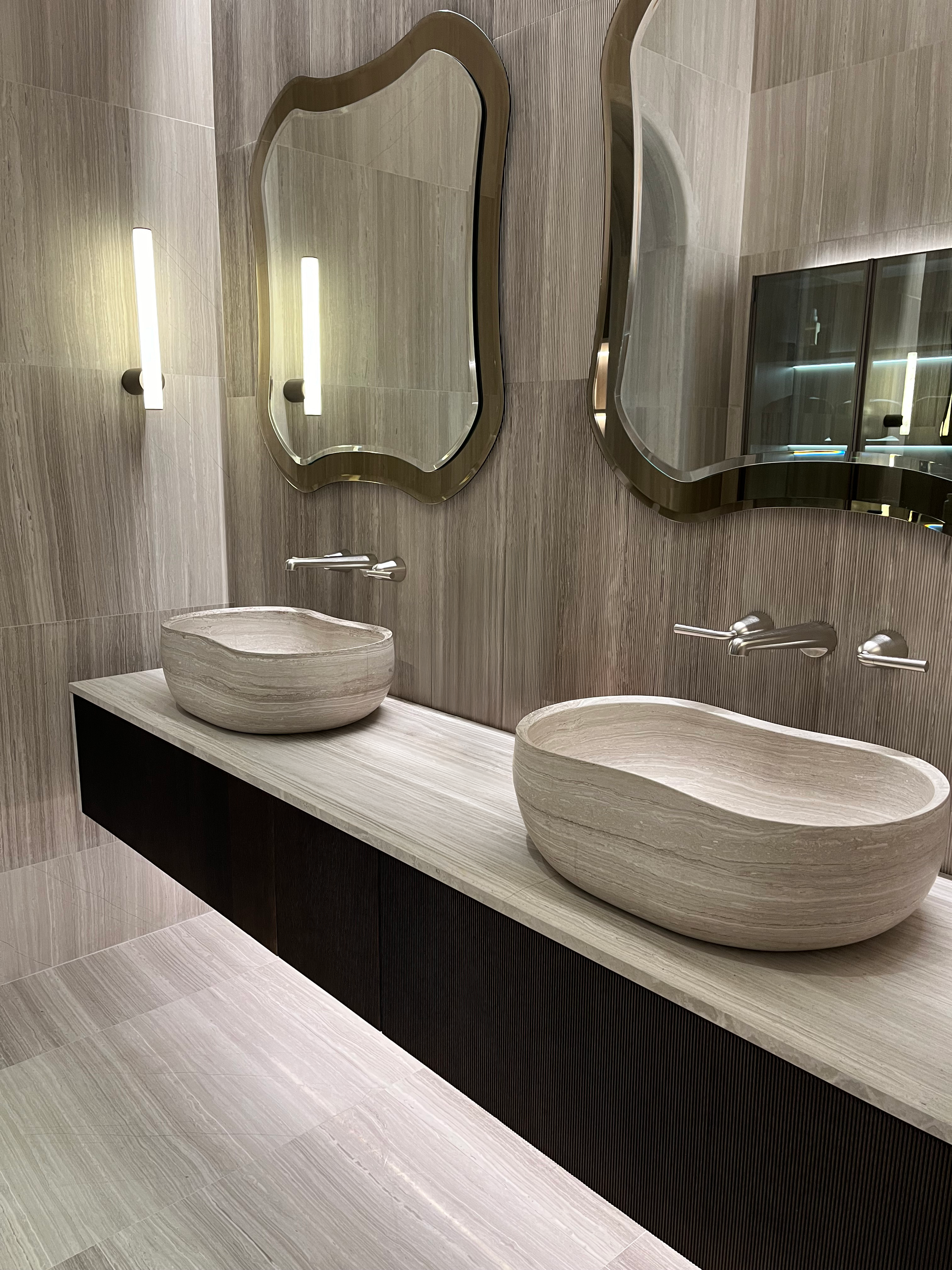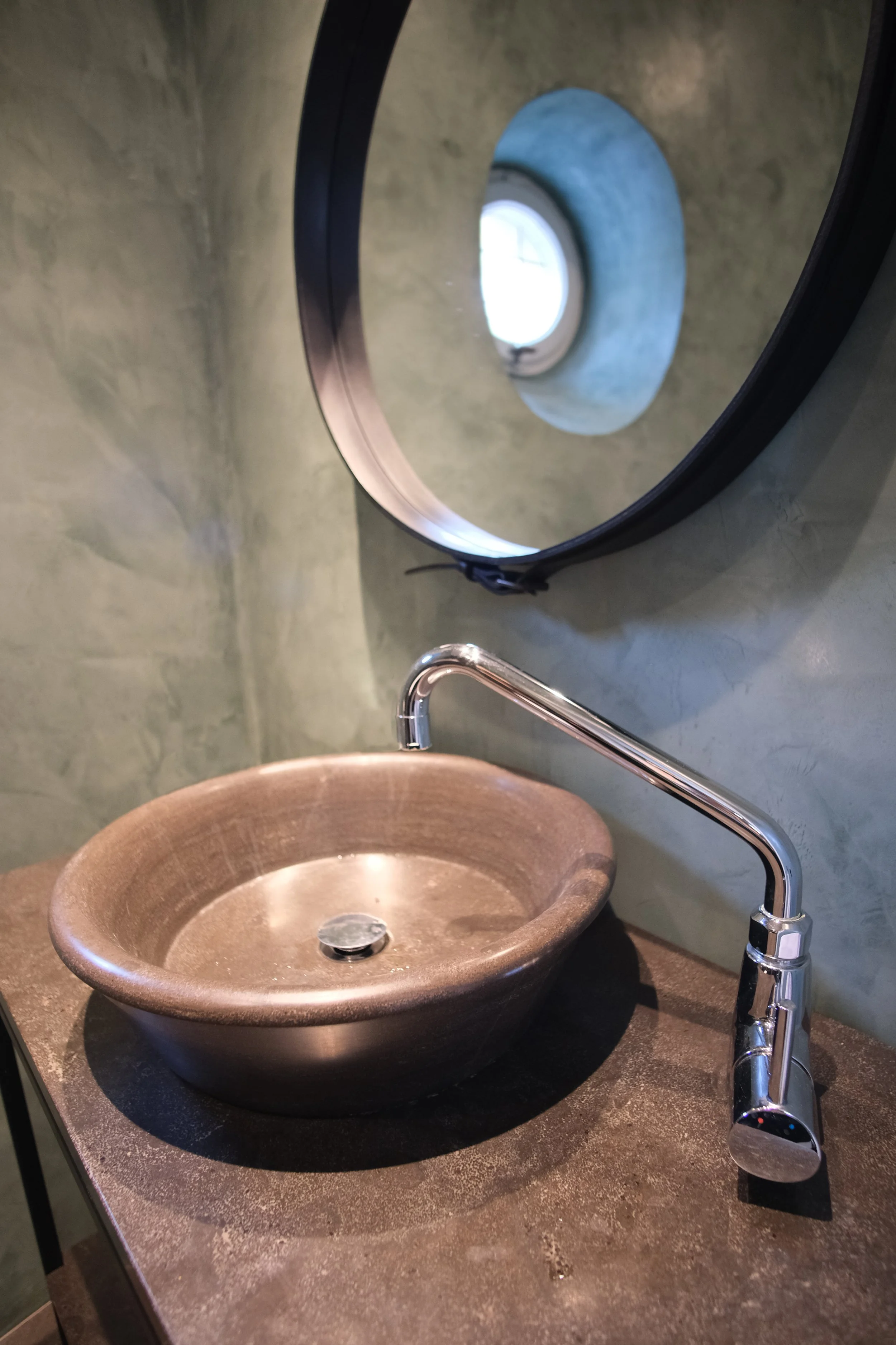 A bathroom with Salvatori stone walls and a sculptural stone sink, creating a calm and timeless atmosphere.